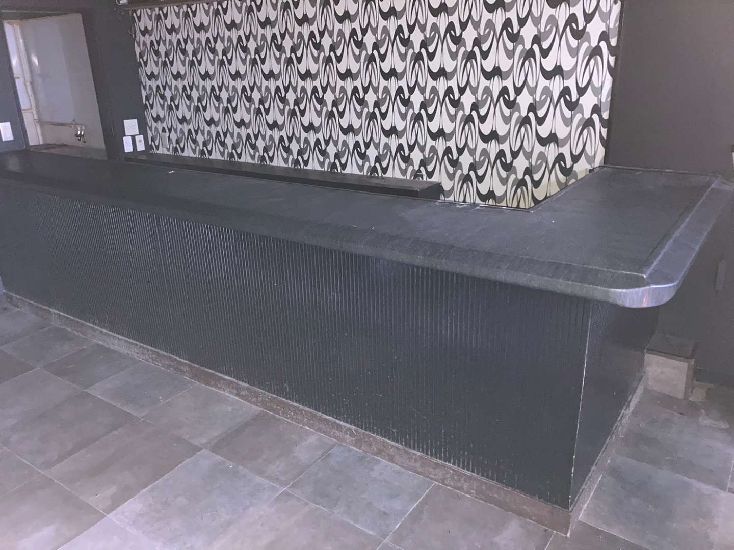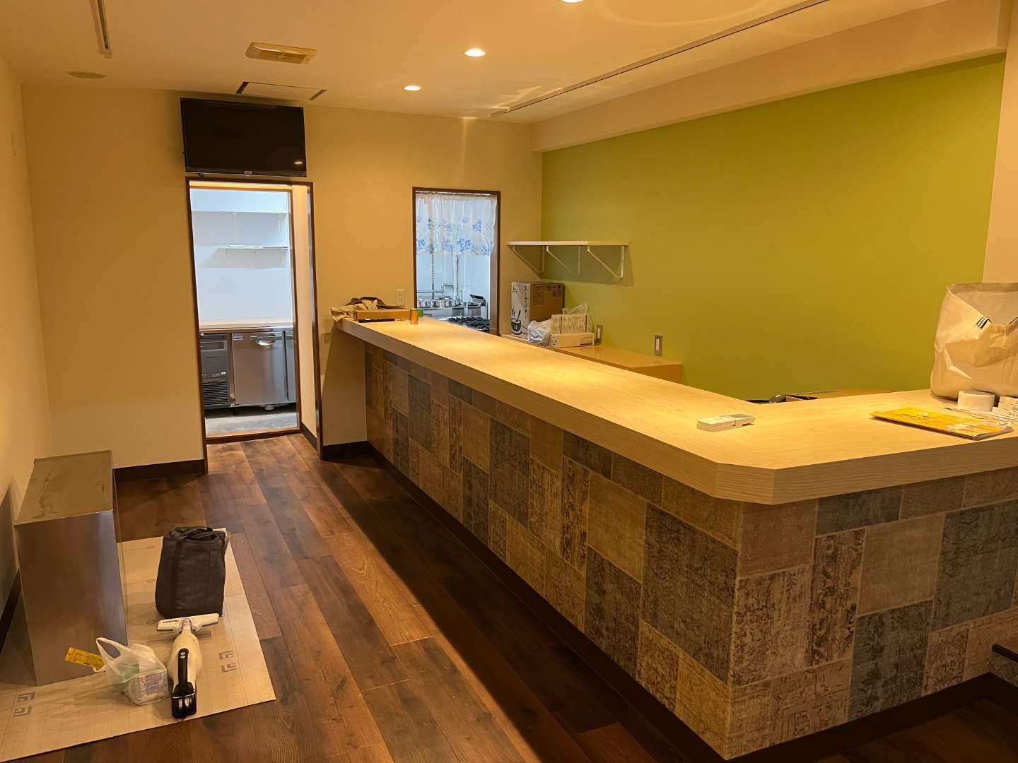 カウンターは新設にすると金額が高くなるので、形はそのままで、コンパネで下地を作り、天端はメラミン貼り、腰壁はフロアタイルで仕上げさせて頂きました。木目調を活かしつつ、店内を明るく仕上げました。
